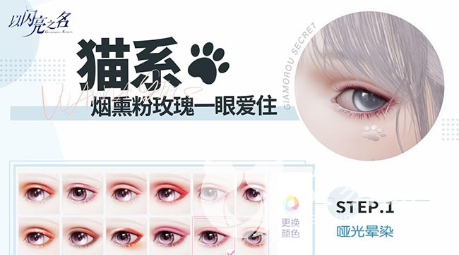 猫系妆容在网络上火爆一时,现在也流行到手游上。这款妆容性感妩媚,大气清透,适合不同服装造型。整个色系偏向水红色,青春明媚。仔细查看整个妆容,会发现重点在于眼睛部分。