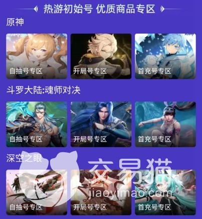 除了小编上述说的这些,平台为我们还提供了很多的便利服务,他为不同的账号不同的游戏,都设置了专区,让我们寻找自己想要的账号过程变得更加的方便,另外平台还为我们提供了游戏的官方道具、角色,这些也是有这专区可以让我们进行选购的,在交易猫购买这些物品绝对是特别划算的,代练服务在这里也是可以找到的哟,想要体验这个平台的朋友,不妨赶紧点击下方链接,开始体验吧。