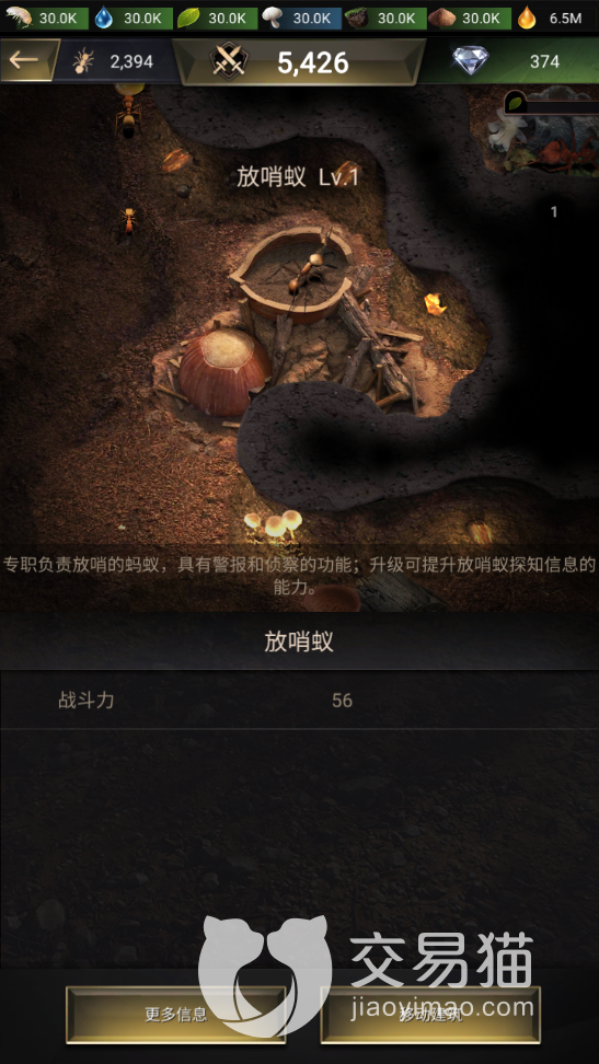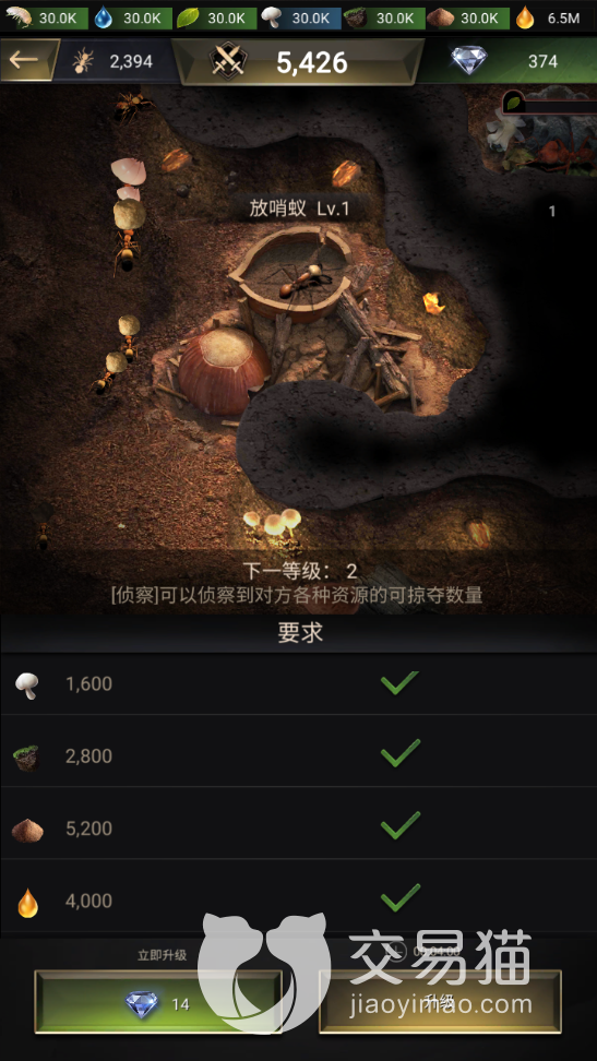 提升放哨蚁等级的方法首先是找到它所在的巢穴,然后点进对应的升级面板消耗若干数量的四种材料即可进行,在材料的需求上,它对于沙子和蜜露是要求最高的,所以想升级它的朋友建议把蚜虫多多培育一些,另外部分的发展蚁也会对这两种资源的生产与采集起到重大帮助,大家可以去特化蚁列表中翻找一下,然后进行孵化。