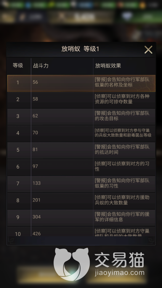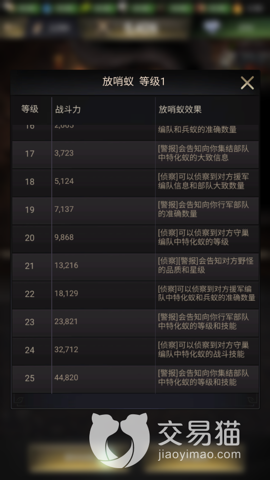 当然,等级提升后最大的改变还是它在侦查能力上的提升,除了对于侦查敌军部队的范围面变广了一些外,在中后期的升级中,你还将愈发清晰的获悉敌军部队的详细数据,其中包括了它们的部队兵蚁数量,以及带队的这些蚂蚁所拥有的技能等等。