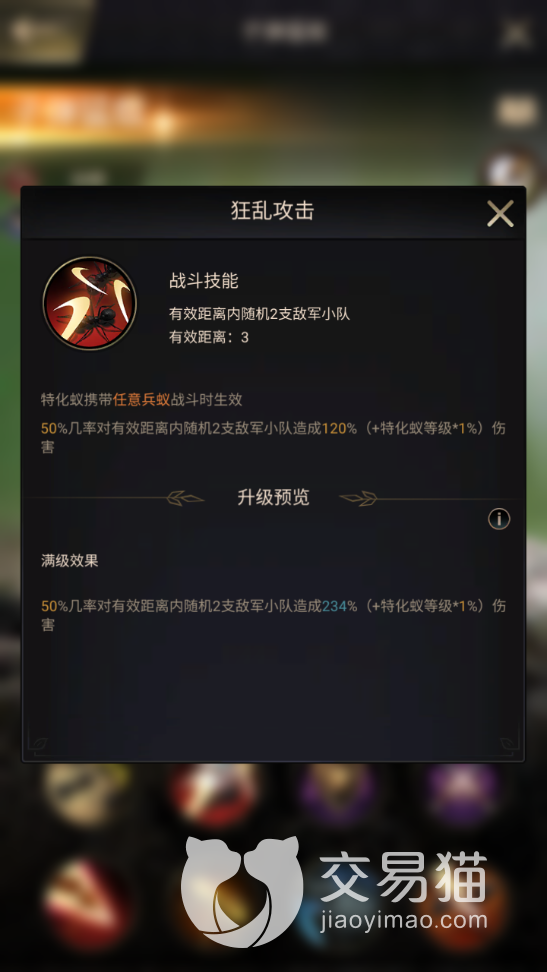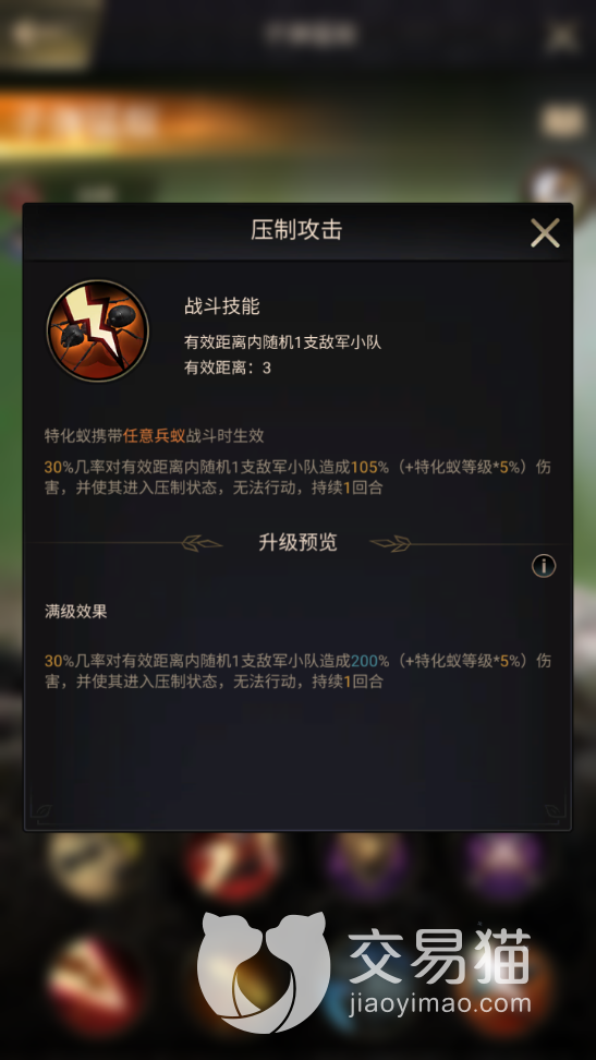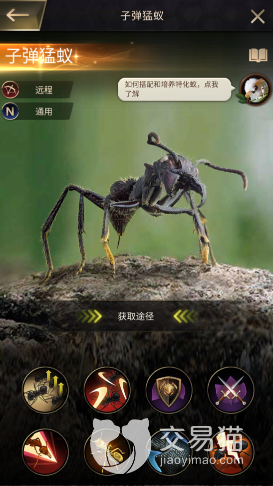 从其页面上的标签来看,它的定位属于远程部队的指挥官,不过对于队中蚂蚁的构成并没有具体的要求,任何品种的兵蚁都能够被它率领,并享受到指挥技能中的增益。而且其战斗技能的触发也十分自由,因此玩家在对抗不同的敌人时,可以灵活变换队伍中的小兵。