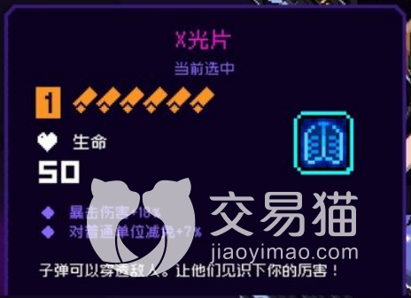 x光和弹夹,第一个可以的基础面板可以增加50点生命,这个生命值可以和宽恕帽搭配,让宽恕帽的生命值百分比加成更高,x光的词条还能增加暴击和受伤减免,弹夹的面板可以增加四点攻击,另外也有不错的攻击加成,最重要的是它有一个攻速加成,这个加成有20点这就非常舒服了,在战斗中有这20点的加成可以多打很多下。