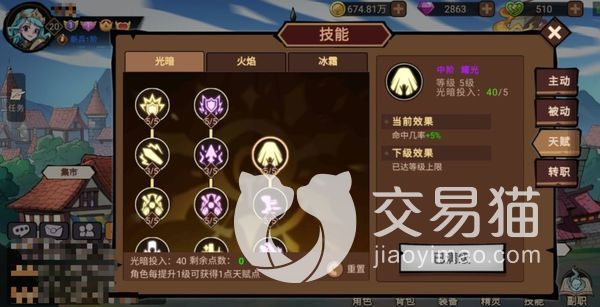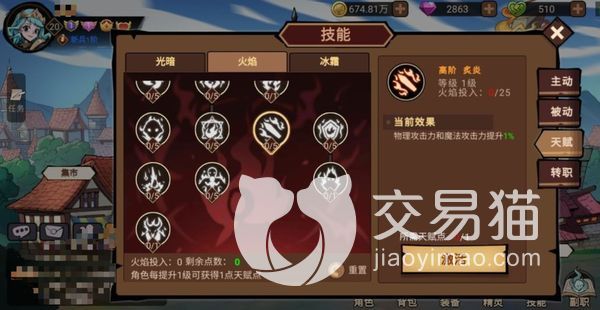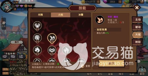 首先给大家介绍一下这个游戏中有哪些天赋,这些天赋可以分成三大类,火焰类,冰霜类以及光暗类,第一种火焰系的话,它主要的属性效果是属于攻击类的,而冰霜系的话,更重要的是在防御方面最后一个光暗系列,是两者都有的。