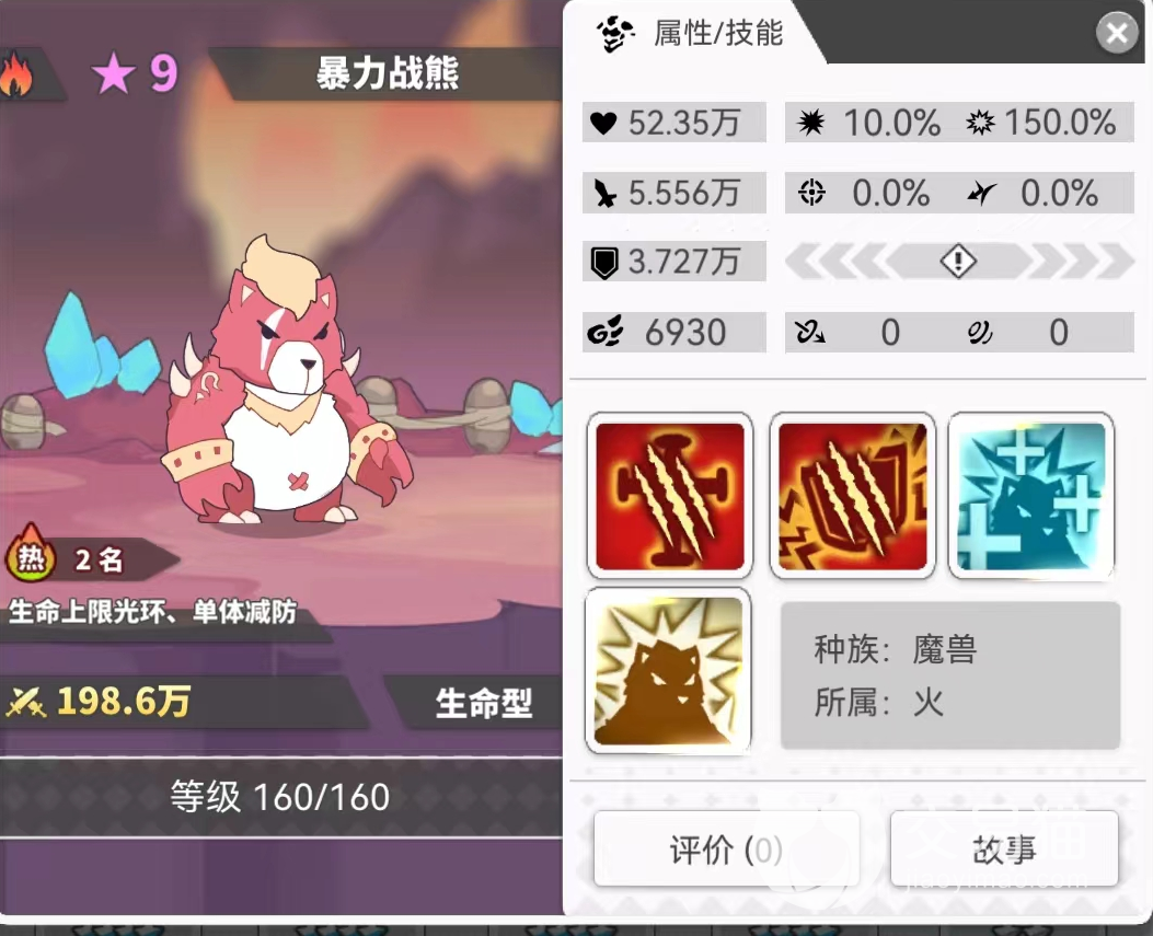 然后我们再看一下火熊,火熊就是我们在游戏中说的暴力战熊火属性,它既有非常高的血量和恢复能力,又有针对对面前排的百分比伤害,所以它的作用在阵容中是非常的强大。