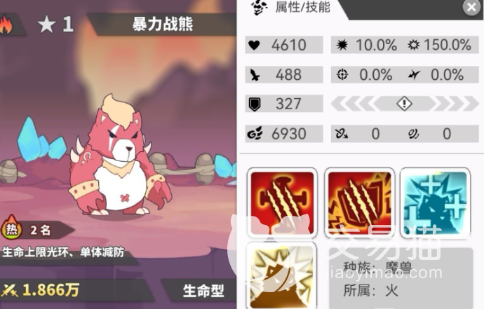 对于这名就是,一般玩家都是需要火属性的,因为顾名思义,真的很暴力,并且获取的难度也不高,算是比较亲民的角色,在游戏里面它的出场率不低,并且使用起来相当的广泛,不论是在什么类型的阵容之中,它都能够发挥出自身应有的作用,不论是氪金与否,都免不了会去选择一个暴力火熊作为自身阵容中的常驻角色。