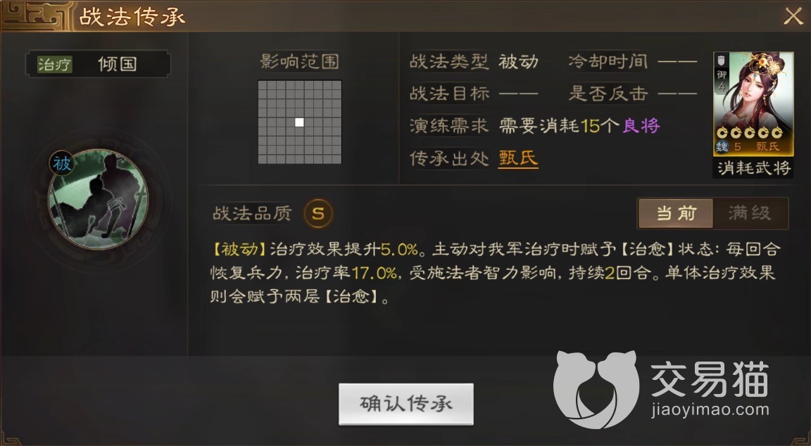 而这个角色的战法传承也是治疗类型的,它是一种被动技能,在满级的时候会提升百分之十治疗功效,可以主动为己方人员添加治疗效果,每个回合都能够回复一定数量的兵力,此处的治疗率大小也是受角色的智力影响。