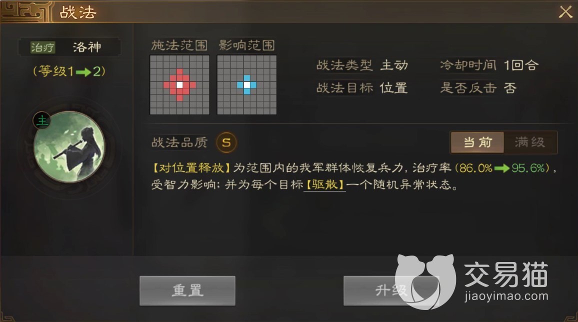 而她的战法名叫“洛神”,这个技能是范围性的攻击方式,能够对一定区域中的己方人员进行兵力的恢复,在满级的时,这个技能的治疗率会达到百分之一百七十二,这是受角色智力属性影响的。此外这个能力还可以为队友减少一个负面状态。