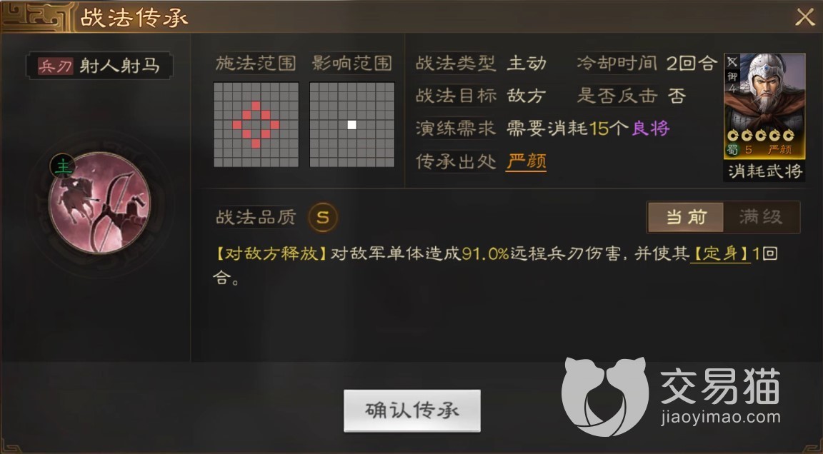 而对方的传承战法也是主动类型的技能,它的演练需求是得要消耗十五个良将。它的功能是在满级状态下,可以对敌方单体人员造成百分之一百八十二点远程的攻击伤害,并且会将对方定身一个回合。