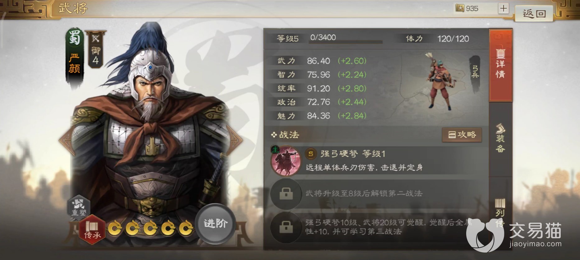 这个人物在游戏中的定位是弓兵,而他本身是属于蜀国的武将,此处他的综合属性基本都是偏高的,并且数值都很均衡,其中相对要高的是统率,而偏低的是政治属性,由此可见他是一名不错的将才。