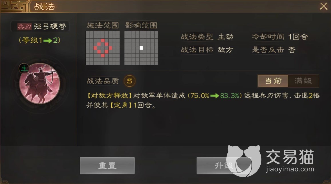 此角色的战法属于攻击类型的,被称作为“强弓硬弩”,它的主要作用就是在此技能达到满级的时候,将会对敌方单个人员曹成百分之一百五十的运程攻击伤害,还会将对方击退两个格子,并且在这个回合中对方会处于定身状态。