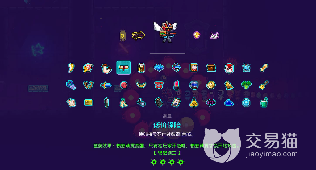 最强的搭配当然还是愤怒精灵的玩法了,其中只要玩家携带这个套装很容易在游戏当中刷出低价保险这个道具,使用这个道具可以获取很多的金币,捡到之后就能触发方舟然后捡到护盾,相当于无限的血量,只要不被被秒掉就不用担心血量。
