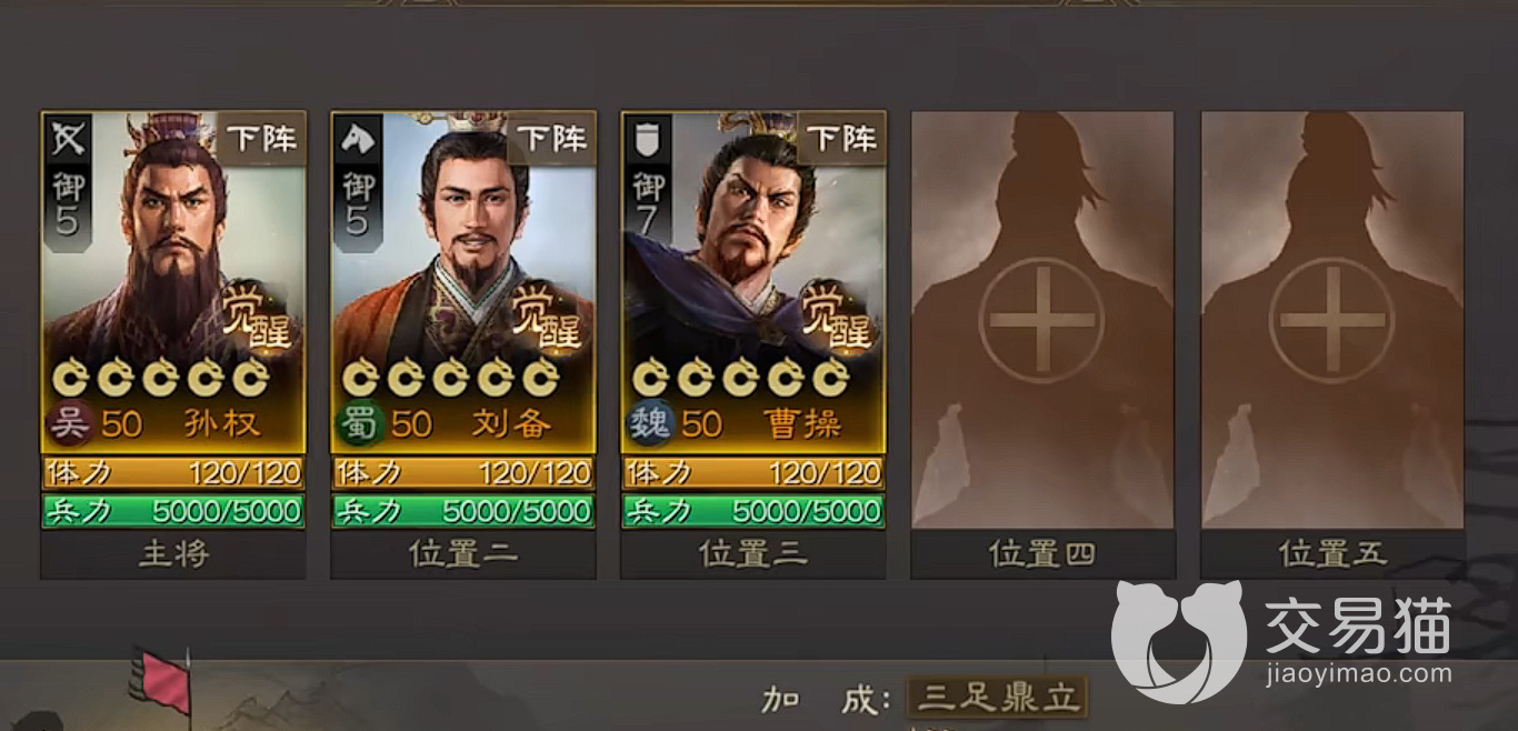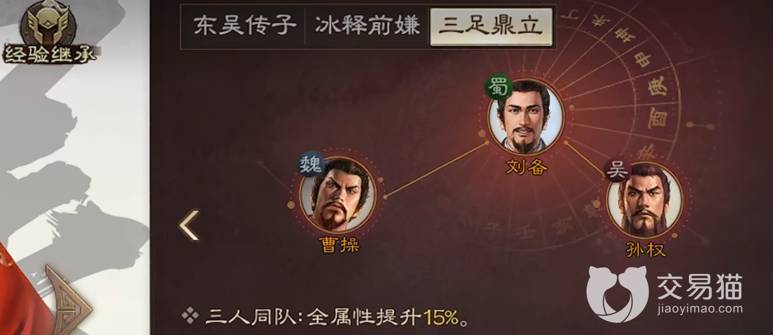 我们都十分清楚三国志这个游戏基本上都是围绕着魏,蜀,吴三个国家进行构成的,每个阵容都有着自己专属的羁绊以及主要武将特色,那么,如果我们将三国的首领聚集在一起,又能抽出怎样的羁绊呢。在游戏中,官方特意设置了一个三皇羁绊,刘备曹操孙权,三个人为集团的首领可以凑成三国鼎立的强力buff,三人同队的话,将全属性提升15%,这是什么概念,作为五子良将的属性羁绊,他们也只有武力值提升4%,三足鼎立是他的3倍朝上,这使得大部分情况下,光靠素质就可以碾压绝大部分的队伍。
