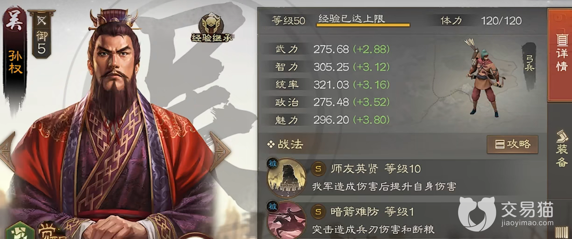孙十万,不同于另外的两位君主作为弓兵的他自带战法,可以将自身所受到的buff释放出去,消耗一些增益用来增强队友。所以一定要带上传承战法形机军略来补足高额的输出和谋略伤害,简单来说,这个就是一个能辅助的输出射手。