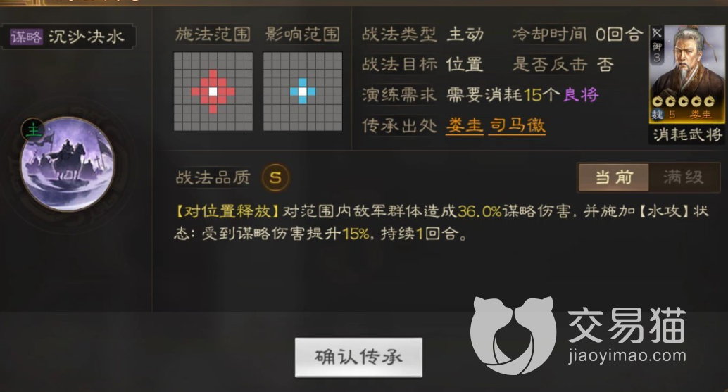 战法方面娄圭有一个s级战法,该战法可以对降低敌人造成的伤害,降低属性为百分之10,切只要吃到伤害的敌人就无法移动,会消耗掉自身的所有移动点数,这个效果最多可以存在六回合可以说只要敌方有人吃到了那就别想动了战法方面娄圭可以说比很多金色武将还要强。