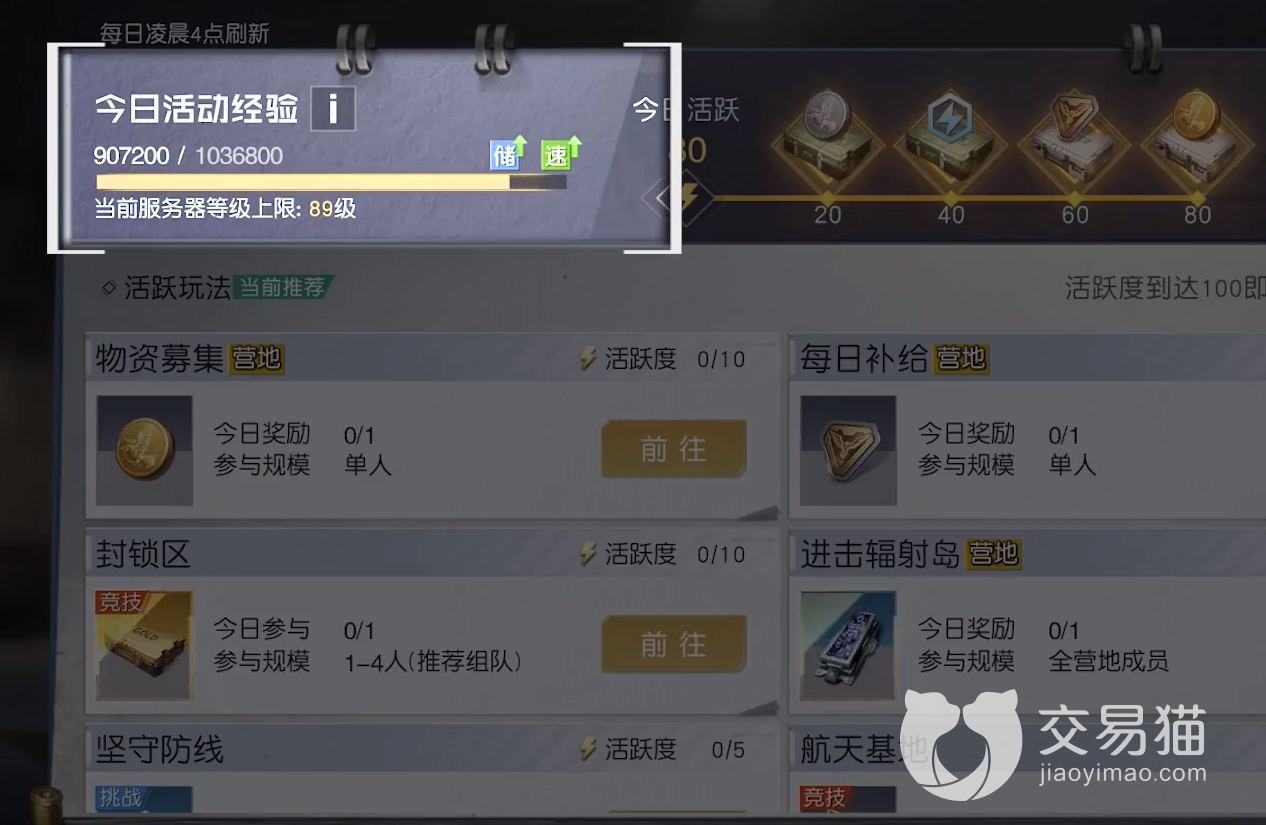 与经验任务作为前置的地位相比,活跃任务的形式更多一些,给了大家每天充分选择的空间。完成活跃任务会有活跃度,不仅会给物资奖励,每天每达到一定的活跃度档位,还会额外获得奖励,属于手游提日活比较经典的玩法系统了,活跃任务不用清空,就可以领到每天上限奖励,因为只要做完了经验任务,就已经有了80的活跃度,而每天的活跃上限为100,所以选一个自己最喜欢的玩法形式即可,不过你想做其他活跃任务,收集任务本身的奖励也是没问题的。
