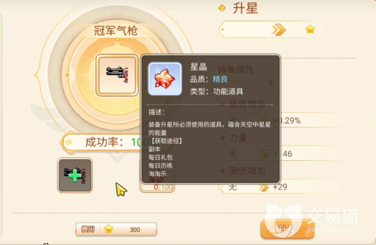 升星除开相应的材料以及装备以外,还是有一定成功率的,成功率的不同也可能导致我们之后获得的装备的差异,简而言之,我们还额外需要另一件较为稀有的物品升星石,装备在升星的时候会不断的降低成功率,从初期的100%一直往下降,这个东西可以帮助我们补足装备升星的成功率,也是后期相当重要的材料。