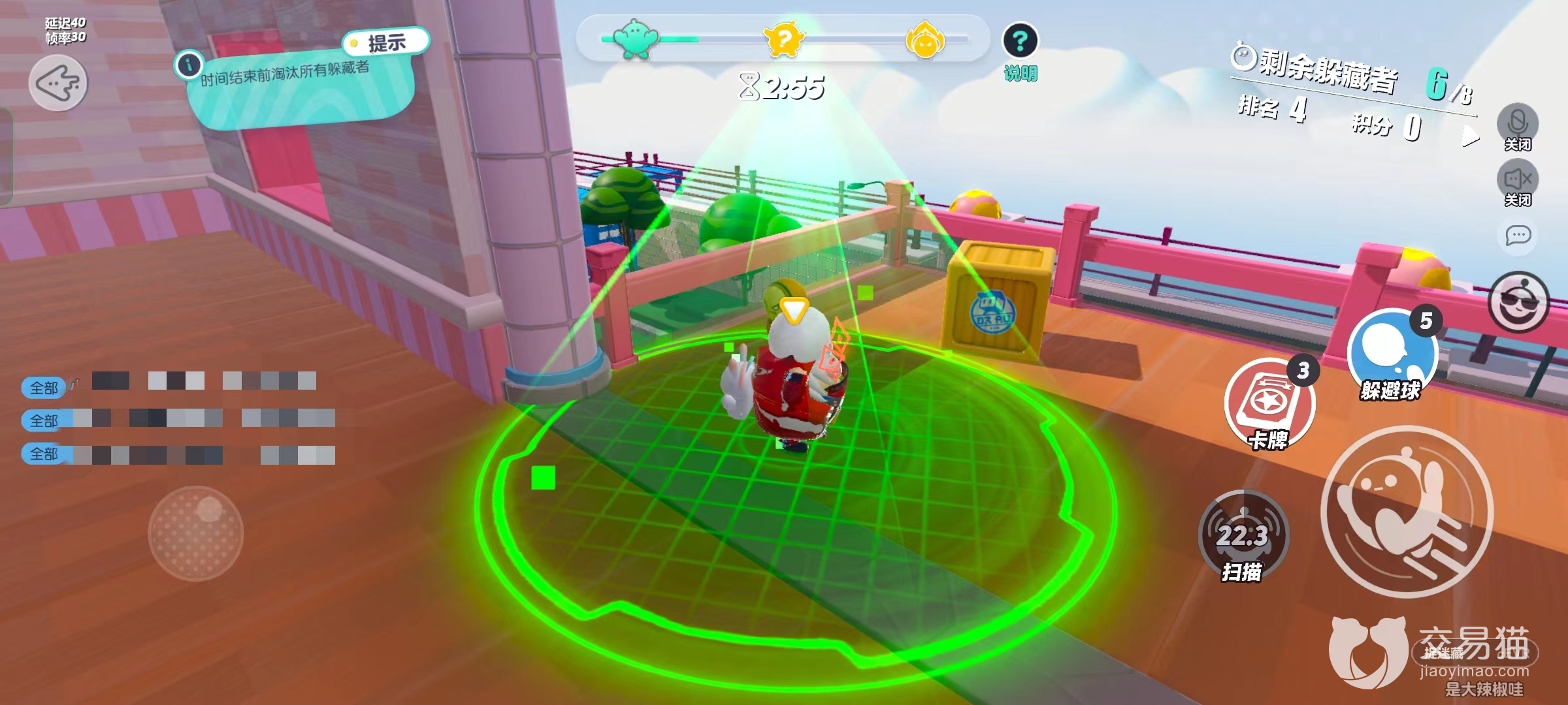 追捕者玩家还拥有扫描这个技能,开启之后会在一定时间内出现扫描框,扫描框中出现颜色变化就说明当前位置一定拥有躲藏者,因此玩家一定要好好利用扫描获得游戏胜利。
