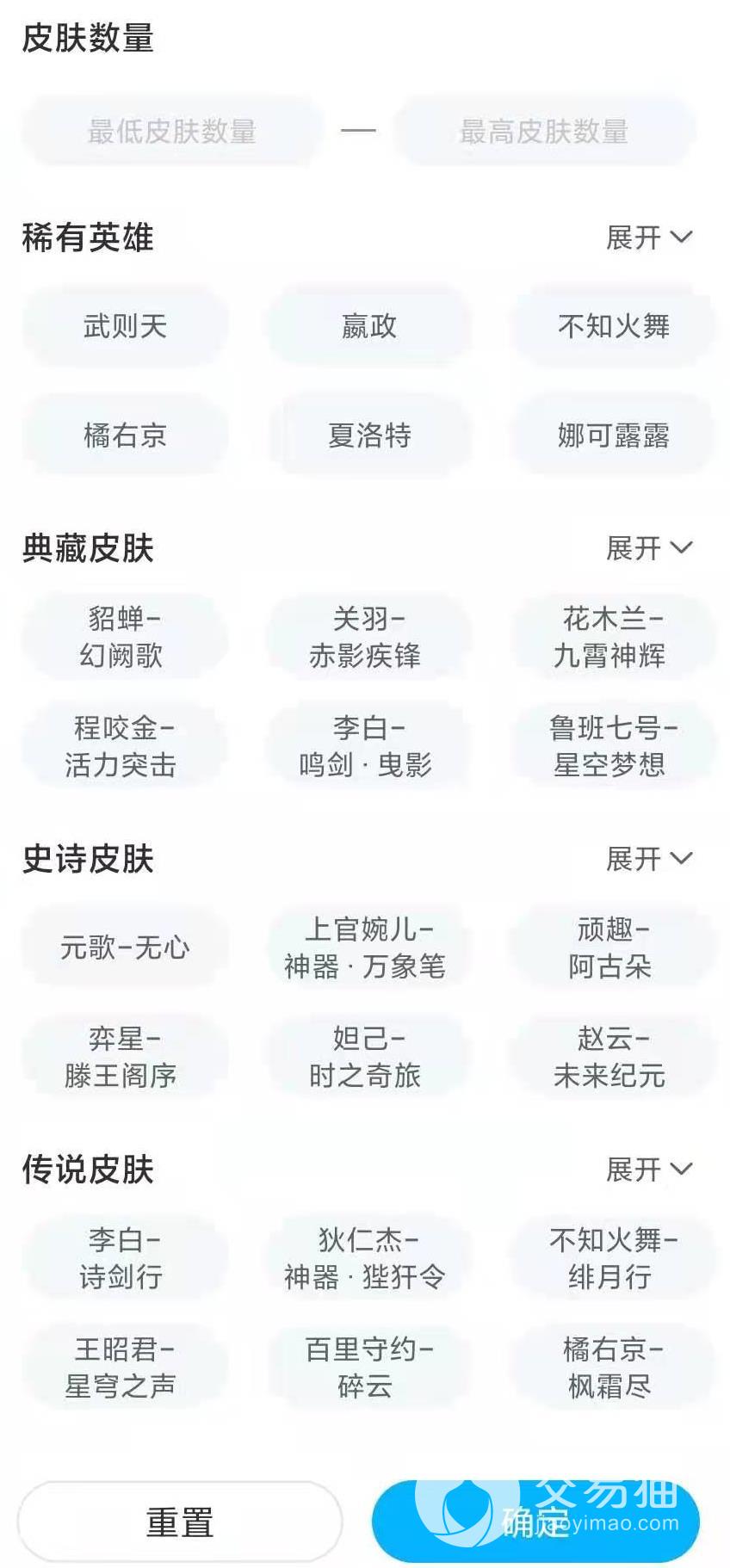 交易猫上王者资源看似繁多,但是挑选起来也可以很轻松。王者账号商品的标题就有英雄和皮肤的数量,还有最新或热门皮肤以橙字显示,不需要一个个点进去查看。如果大家针对性地想搜寻包含某款皮肤或荣耀水晶的账号也可用筛选,其中可勾选不同品质的皮肤和最低最高的VIP等级、英雄数量,还能自定义价格范围。