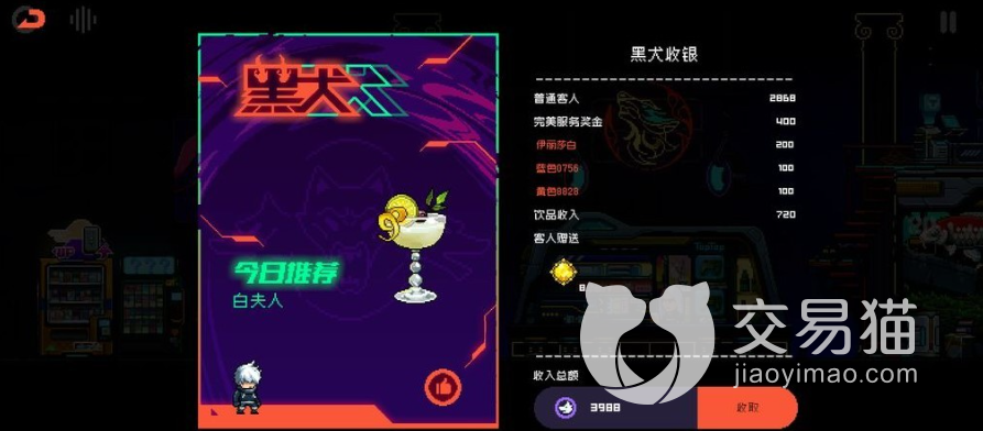 2、每日调酒:在这些玩家可以通过调酒来获得少量的霓虹币和角色好感度,如果玩家不知道怎么样调酒,那么可以记住一个人的口味,每天给他一个人调酒就可以了。