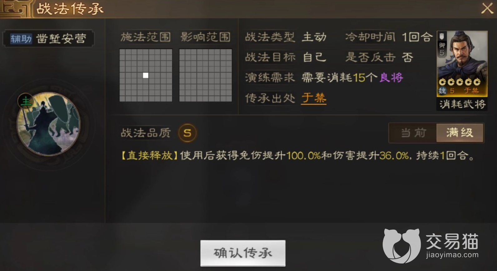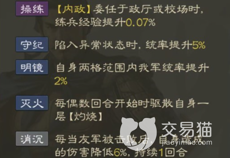 “凿堑安营”,这个是S级的主动战法,效果十分简单粗暴,使用后可直接获得100%免伤与36%伤害提升,在大部分的战斗中,只要该技能一出,就相当于这回合内敌人对你的伤害直接为零,而你却能在大幅的增伤中将敌人击溃。而且于禁在特性也有着丰富的加成,不仅有着两项统率方面的提升,而且被被委任到相关机构时,还可提升练兵效率。