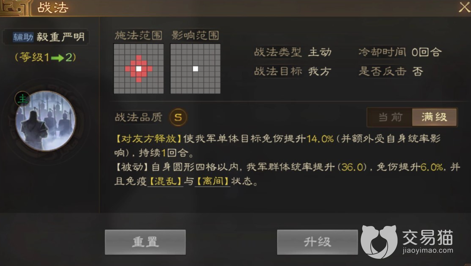 首先来看“毅重声明”,这是他自带的一个战法,可以对友军的单体目标施放,效果表现为一回合的14%免伤提升,而且还拥有一个十分强大的被动效果,它能够使四格范围内的军队统率与免伤显著提升,并且使他们直接免疫“混乱”和“离间”状态。