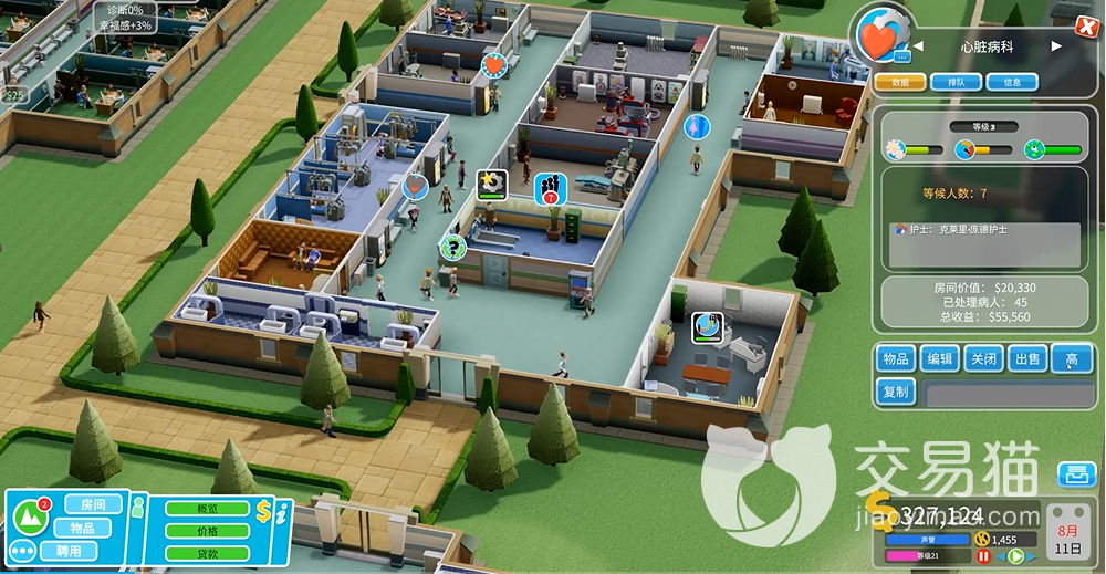 多放建筑也会影响到医院的价格,特别是外面的喷泉是一定要放的,越大越好,病房的话可以升级,升级到5级就能带来非常大的价值增益。