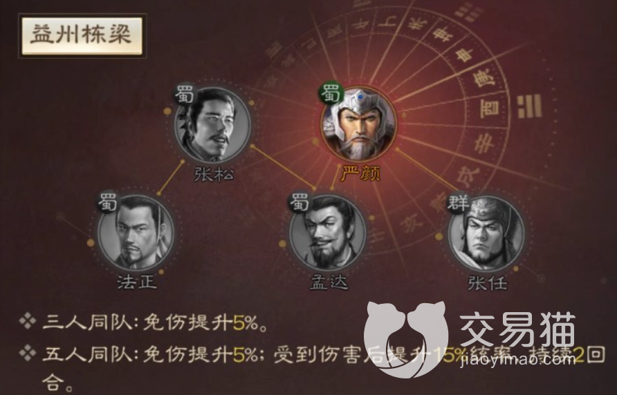 反蜀国的重要角色,可以搭配严张等角色增加免伤和统率能力,该角色的功能作用大于专属搭配,所以多用来做特殊的作用来使用,比如地方技能使用多自己抵挡不了的情况上这个角色可以增强自己ide队伍。
