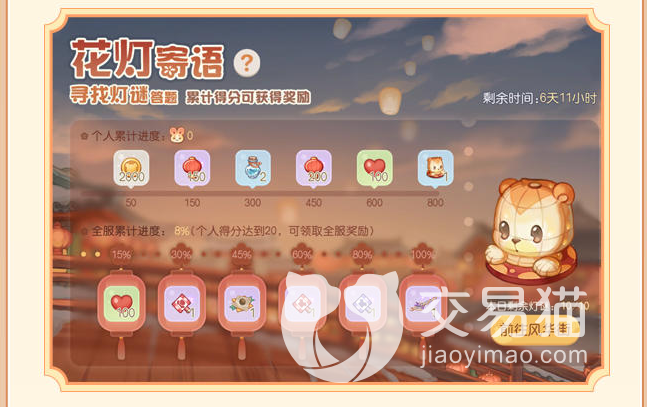 同时各位能够完成对应的任务就可以获取到想赢得奖励,里面会有兑换道具和金币。后面还会有个名叫花灯寄语的活动,各位只要在游戏中寻找摆放在各处的灯笼,然后将上面的谜题解开,之后累积到一定的数量便可以获取到对应的奖励。
