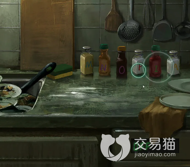4、这时候,洋娃娃的身上就会出现一排字。然后你来到厨房,根据字将厨房的调料按照字的顺顺序放好,就能够得到钳子啦。