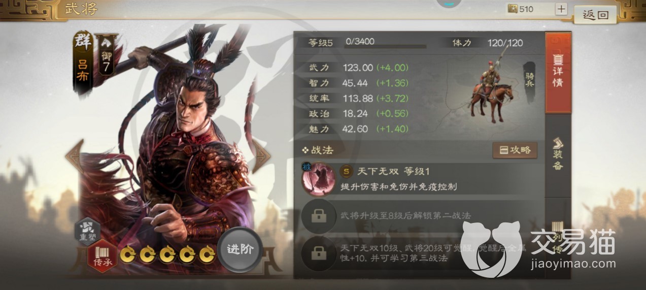 传承战法“骄兵之计”可以对范围内的的敌人造成群体谋略伤害,使其受到的兵刃伤害提高15%。提升技能等级造成的伤害会提升,但易伤率不变。作为一个非战斗向的武将,他却有着比较罕见的易伤buff,所以也是有着一定登场作战机会的,能提高队伍输出的上限。
