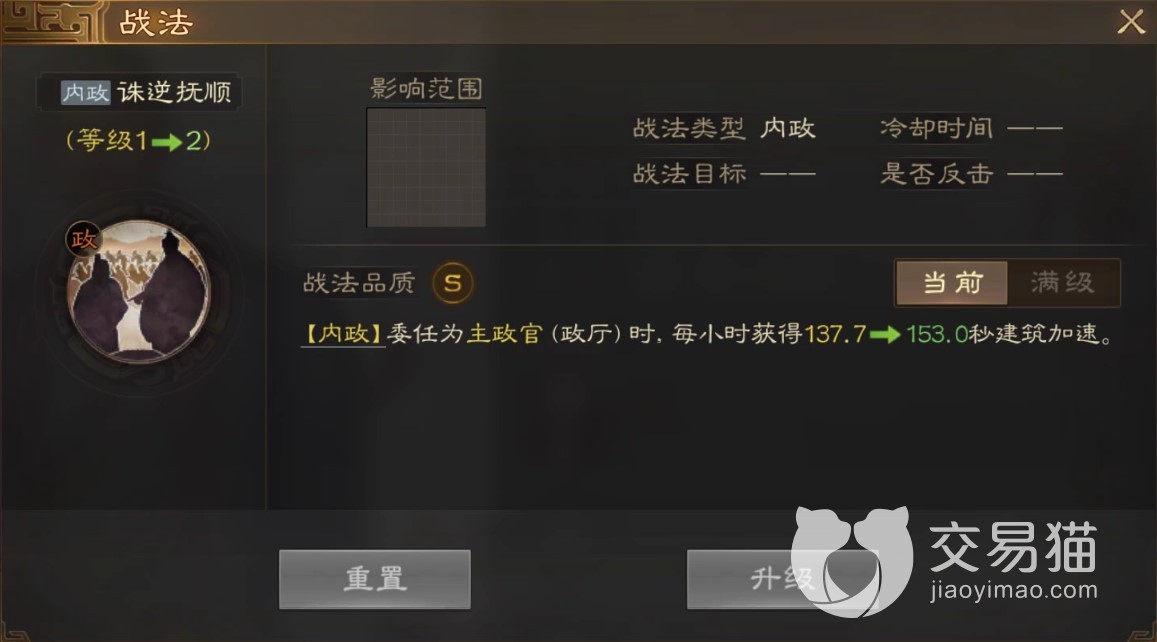 因为是内政向的名将,所以其它战法也都推荐与内政相关的,像是大兴土木、广修水利、修建这类的,进一步缩减建筑所需时间。