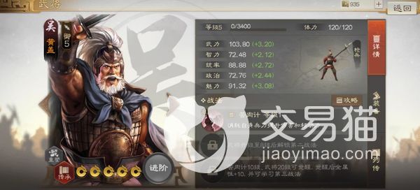 黄盖他在游戏中属于枪兵类的,在他五级的时候,体力值达到了120,武力值高达103,智力72,统率88,政治7,2魅力91,从这个数据中可以看出来,他的武力值非常的高,输出伤害也是相当不俗的。