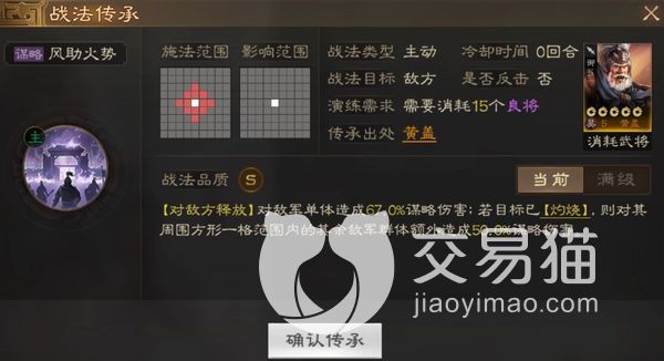 他的战法是苦肉计,但他等级为1的时候就可以直接消耗自己的兵力,然后提高角色的伤害以及移动能力,当苦肉计升到2级的时候,可以在开局的时候直接使用该技能消耗百分之15的兵力,然后把自己的伤害从百分之13提高到百分之14.4,而且角色的移动能力也会提高2,还有他的被动技能也是提高伤害的,可以从百分之15提升到百分之16.7