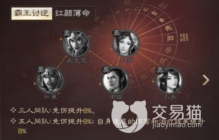 此外,大乔的特性也附带一些友军增伤和治疗up效果,搭配一些其他战法,例如魅惑、仁德载世、长者之风,就可以让大乔具有更多功能性。至于阵容搭配也很简单,队伍中总得有1-2个奶辅,其余的输出角色从吴国武将中挑就是了。