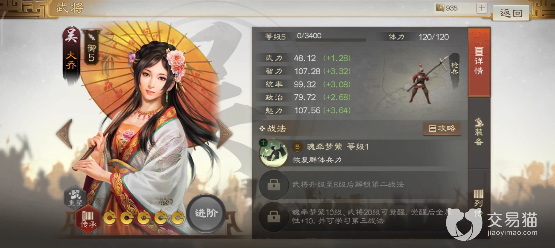 游戏中大乔可以统帅枪兵,在智力、魅力属性方面比较突出。主动战法“魂牵梦萦”可以恢复群体单位的兵力。该技能是二段治疗,第一段为单体目标恢复兵力,第二段则是为自身周围四格范围内的单位恢复兵力,治疗率会受到智力加成,得益于超高的智力,大乔的治愈量很足。