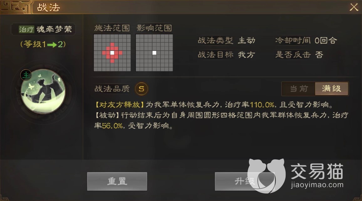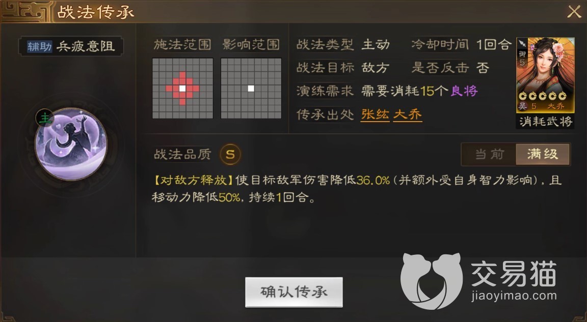 传承战法则是对敌减益类技能,可以降低目标造成的伤害与移动力,降低幅度受到大乔的智力加成,非常有用的技能,能有效缓解我方生存压力,减缓敌方进攻节奏,在一些特定的关卡中有奇效。