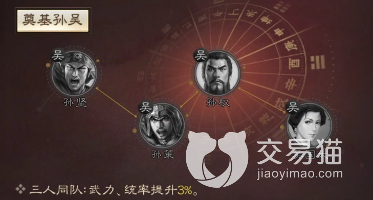 羁绊方面孙坚和可以孙策孙权吴国太组成,羁绊效果可以增加百分之3的武力和统帅率,羁绊效果总的来说一般,特性方面孙策的特性基本都是比较少的增幅特性,比较运有用的只有一个降低敌方伤害的特性。