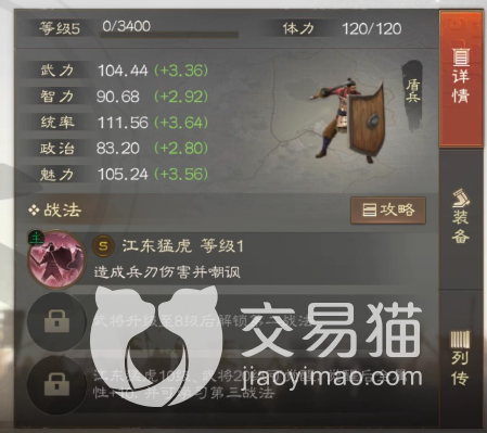 首先是孙坚的属性介绍,属性方面他拥有很高的武力值,在初始阶段武力值就有100多点,后续的成长也有3.36,统率和魅力方面孙坚的属性也很不错,分别有着3.64和3.56的成长度,稍微低一点的就是政治和智力了,不过问题不是很大,毕竟孙坚是一个武将,智力政治这种内勤属性第一点没事。