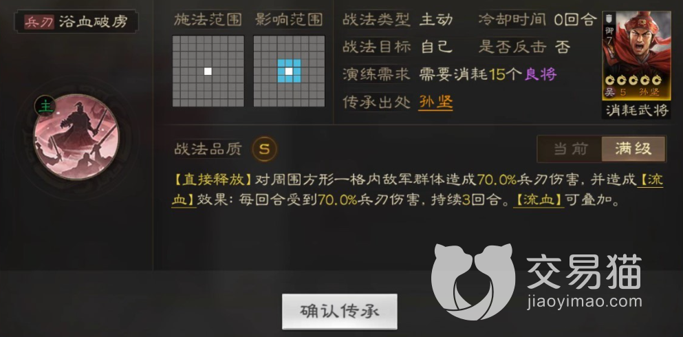 另一个战法也是伤害类型的主动战法,不过这次的效果没有嘲讽,并且还是aoe伤害,释放时可以对附加的敌人造成百分之70的武力伤害,之后还会附带一个流血的效果,这个效果可以让敌方每回合都受到原攻击的伤害,持续三回合,这个效果的离谱程度可想而知,没会和百分之70的武力伤害无法躲避,想起来就吓人。