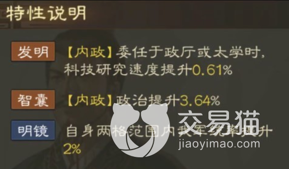 虽然面板普通但是这个角色的技能强,还能教会其他角色智技,影响敌人的智力和武力,是辅助干扰的必备技能,所以就算属性不靠谱也是有自己的用武之地的。