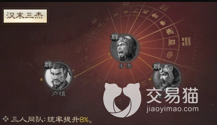 首先就是朱儁,朱儁的属性面板一般,拥有枪兵部队,朱儁的战法是主动伤害类战法,释放可以队敌方敌人造成群体伤害,并且会添加一个每回合掉血的dbuff,第二个战法也是主动群体伤害,可以对周边的敌人造成百分之44武力加智力的伤害,阵容搭配方面朱儁可以和卢植、皇莆嵩组成汉末三杰的羁绊,这也是下方要重点介绍的,这套体系的组成就是他们三个。