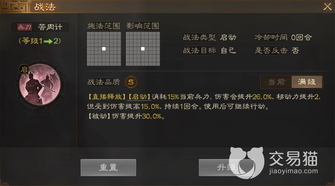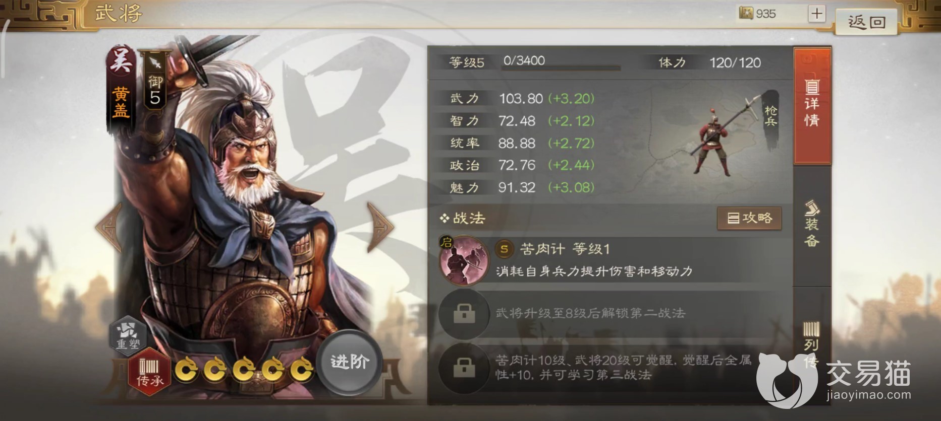 黄盖的武力值非常突出,游戏中统帅枪兵,他的战法为直接释放的启动类技能,能够消耗自己的兵力来提升伤害和移动力。自损15%的当前兵力,来提升最高26%的伤害和2点行动力,但相应的负面效果则是受到伤害提高15%。该战法本身就有被动30%的伤害加成,所以黄盖的普攻伤害非常高,纯菜刀队。