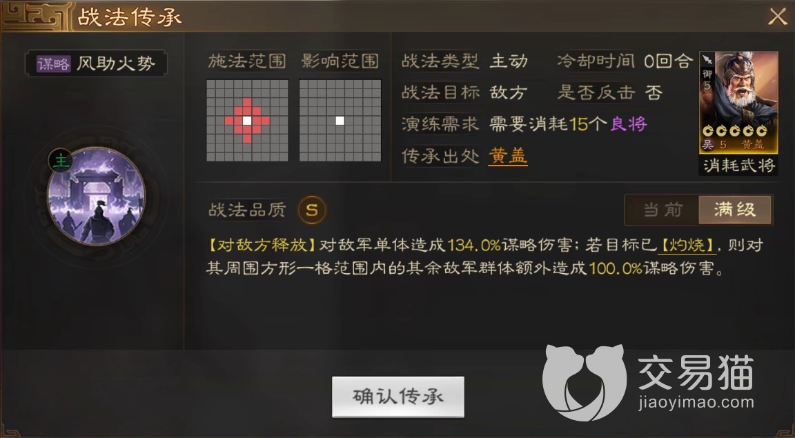 传承战法则是对敌人单体造成谋略伤害,如果敌方身上有“灼烧”buff,则可以对其范围内的其他敌人造成额外100%的谋略伤害,虽然黄盖自身智力属性不高,但架不住伤害率高,所以还是能打出不俗的AOE。