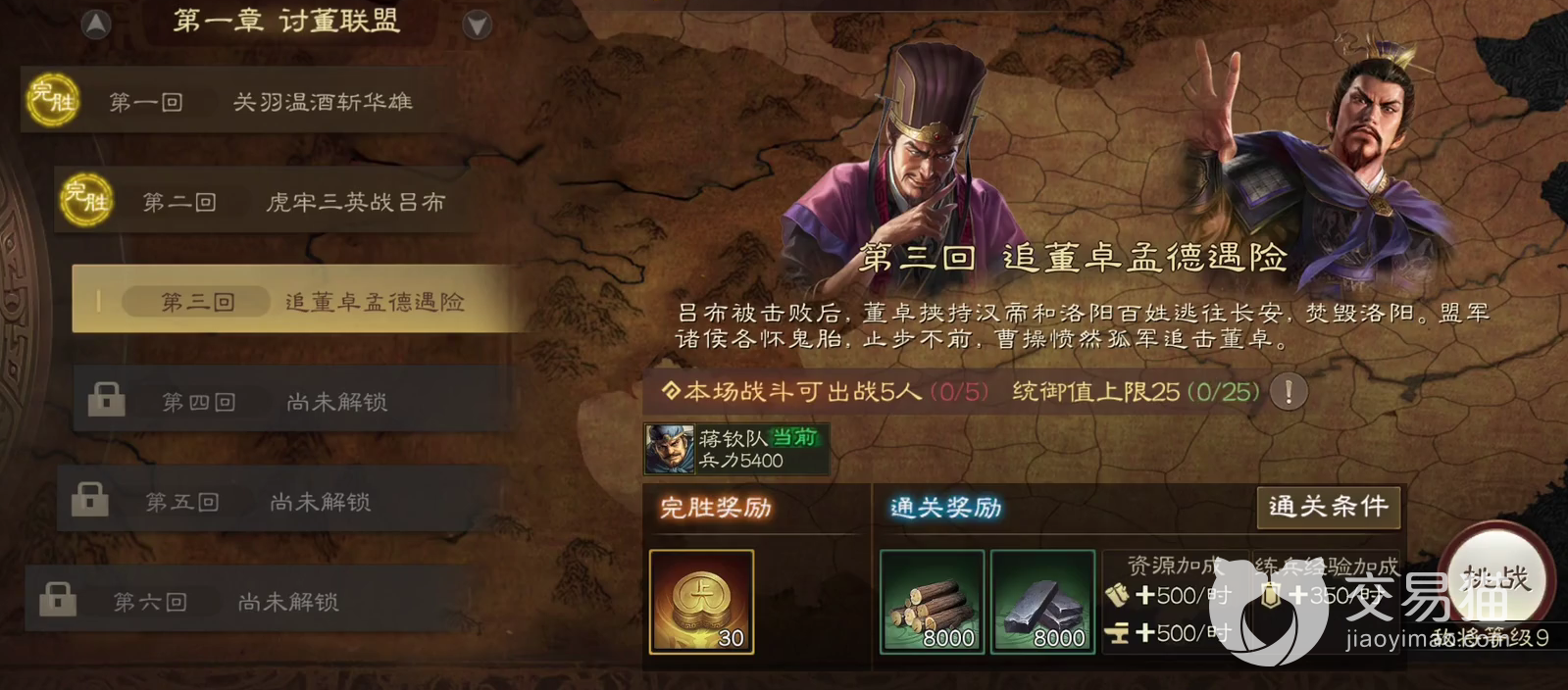 这一关的剧情大致内容是我们要帮曹操去追董卓,敌方的配置方面,除开李儒一个武将以外,剩下的全都是杂鱼部队。不过对面有3个盾兵,血量很厚,不容易消灭,建议带可持续烧伤型的技能。