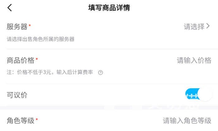在获取卖家身份之后就能够上架我们的账号商品了,在这里除了输入商品的标题和价格之外,还需要录入服务器、等级、职业等信息。这里教授给大家一个小技巧,可以考虑打开议价开关,这样的话可以允许买家报价,提高出售的几率。
