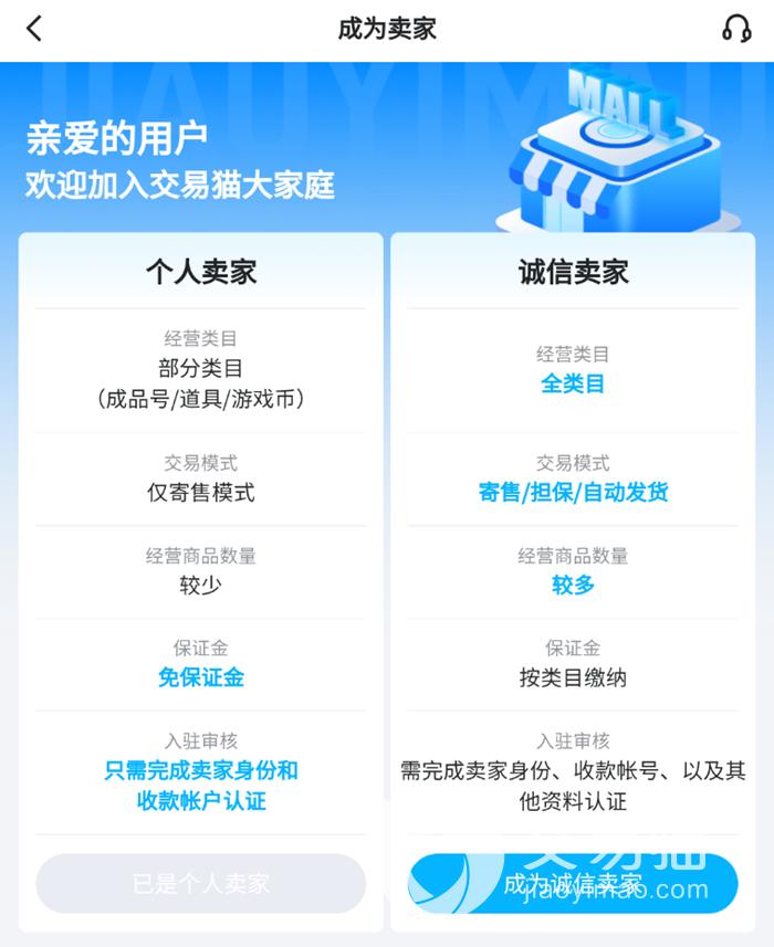 如果大家是自己没事玩玩游戏,然后想要将自己的账号出售,就可以选择成为交易猫的个人卖家。个人卖家的认证方法比较简单,填入规定的相关信息之后绑定支付宝收款账户就可以迅速完成获取。个人卖家是将账号托管给平台进行寄售,不过一次性只能够上架少量的账号商品,对于我们来说也是够用了。而且个人卖家不需要缴纳保证金,是一种成本比较低的卖家资质。