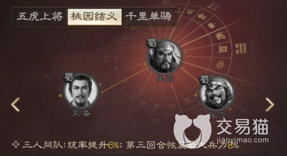 关羽作为桃源三结义中的一角,在游戏中当刘备、关羽、张飞同时上场的情况下3人的统率能力都能够提升6%,而且在第三回合中还能够恢复最大兵力的8%,能够即使的补充兵力。