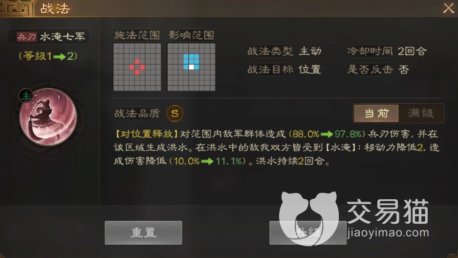 在技能范围内生成大量的洪水,在范围内的敌军造成大量的兵刃伤害,而且在洪水中无论是哪一方实力都会受到洪水的影响,行动能力都会下降2点,同时造成少量伤害,由此可见这个战法技能是敌我不分的。