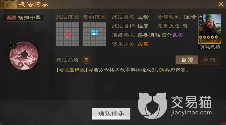 对前方6格的所有敌人造成大量的群体伤害,因此这个技能在冲锋的时候最适合使用,而且关羽所率领的队伍是骑兵,还能够即使的撤离避免让敌人包围。
