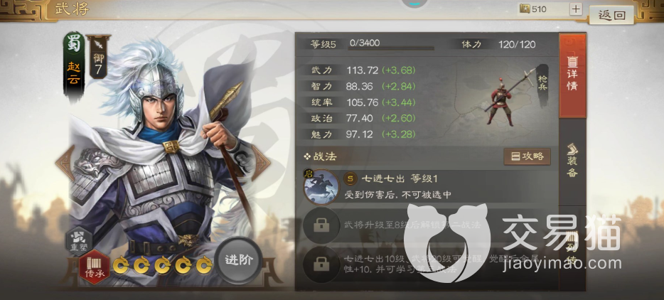 众所周知赵云所使用的武器是亮银枪,所以在游戏中率领的部队也是枪兵,而从属性面板上看能够看到赵云的武力值是113,还是属于一流的武将,而且统率能力也有一百多,所以赵云在游戏中就非常适合率队出征,而且枪兵的攻击距离也是近战中最远了,因此在战斗中也有一定的优势。